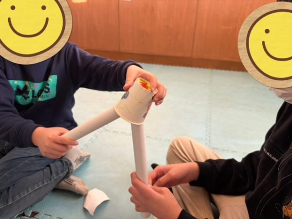 コップを芯にのせて、別の芯を使って落とさないようにコップを移動していくゲーム!!